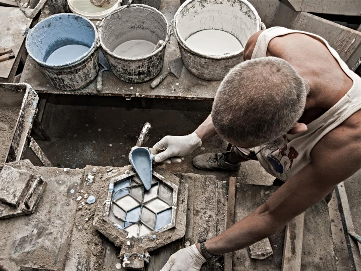 Cement tiles are entirely handcrafted using a precise mixture of cement, marble powder, natural pigments and sand. The visible surface of the tile is created by pouring coloured cement into a compartmentalised metal mould known as a divider. This tool allows artisans to form sharp, intricate patterns without colour bleeding.